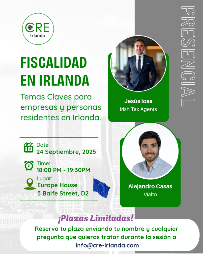 El Consejo de Residentes de españoles en Irlanda se complace en invitaros a una sesión informativa sobre ‘Fiscalidad en Irlanda. En esta ocasión, contamos con la participación de Alejandro Casas y Jesús Losa.